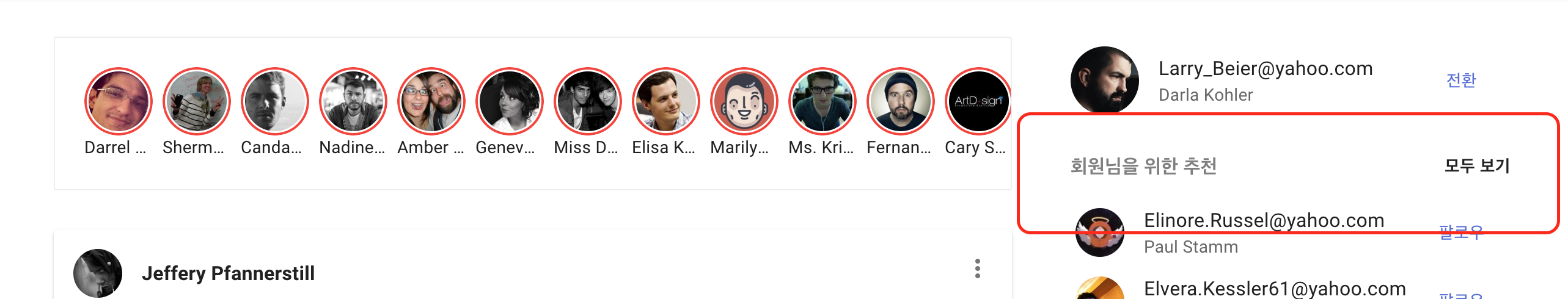 6. suggestions 위에 '회원님을 위한 추천' 타이틀 및 '모두 보기' 버튼 넣기